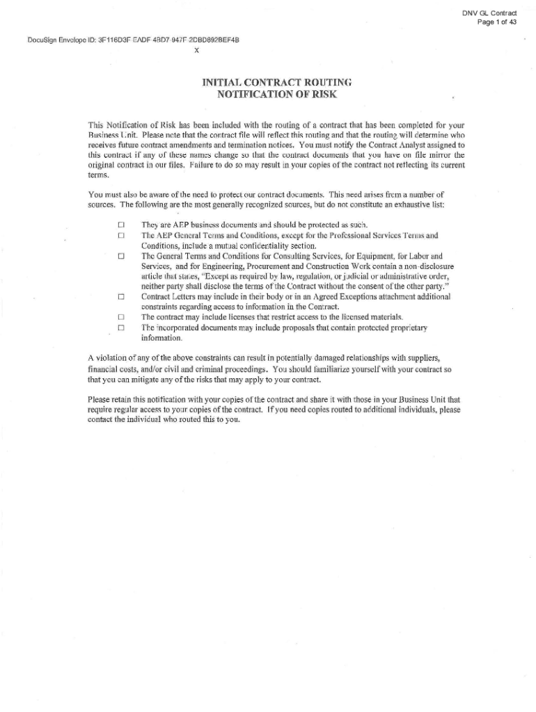 DNS GL Contract Page 1 of 43 DocuSign Envelope 10 : 3F11603FEADF4BD7947F2DBD892BEF48XINITIAL CONTRACT ROUTING NOTIFICATION OF RISK This Notification of Risk has been included with the routing of a