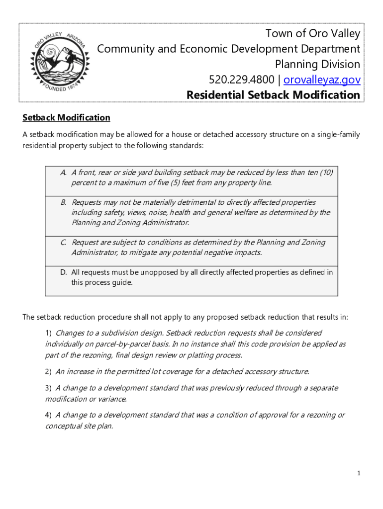 Town of Oro Valley Community and Economic Development Department Planning Division 520.229.4800 | orovalleyaz.gov Residential Setback Modification A setback modification may be allowed for a house