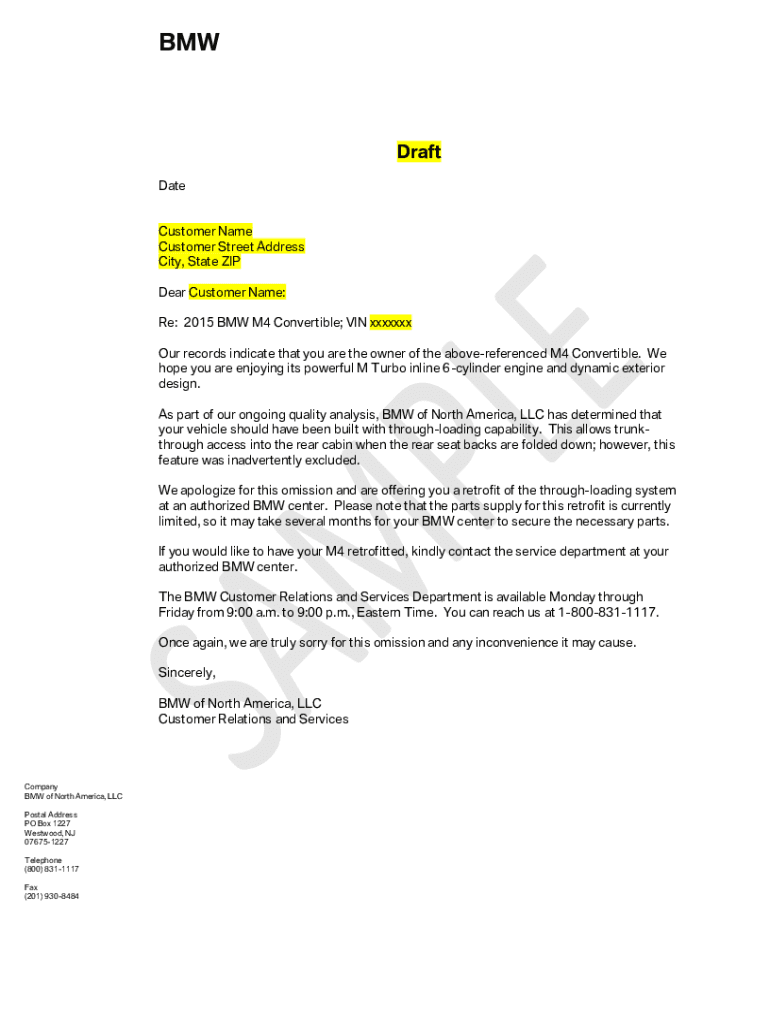 Re: 2015 BMW M4 Convertible; VIN xxxix