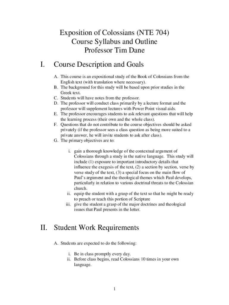 Exposition of Colossians (NOTE 704) Course Syllabus and Outline Professor Tim Dane I. Course Description and Goals A. This course is an ex positional study of the Book of Colossians from the English