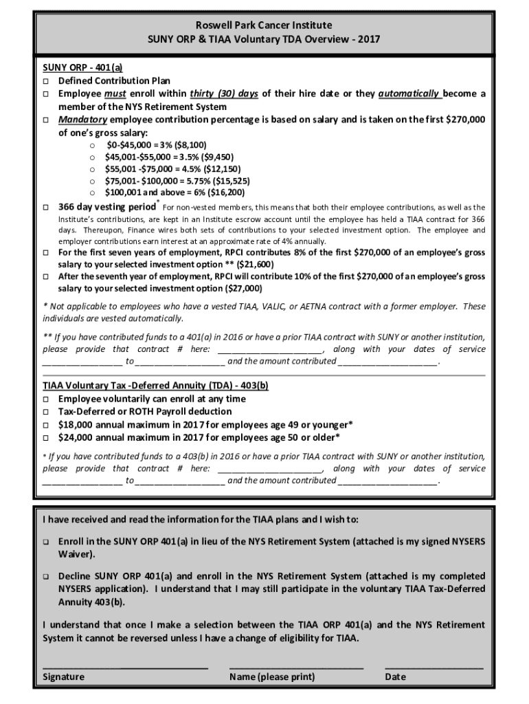 Roswell Park Cancer Institute SUN ORP & TIAA Voluntary TDA Overview 2017 SUN ORP 401(a) Defined Contribution Plan Employee must enroll within thirty (30) days of their hire date, or they automatically