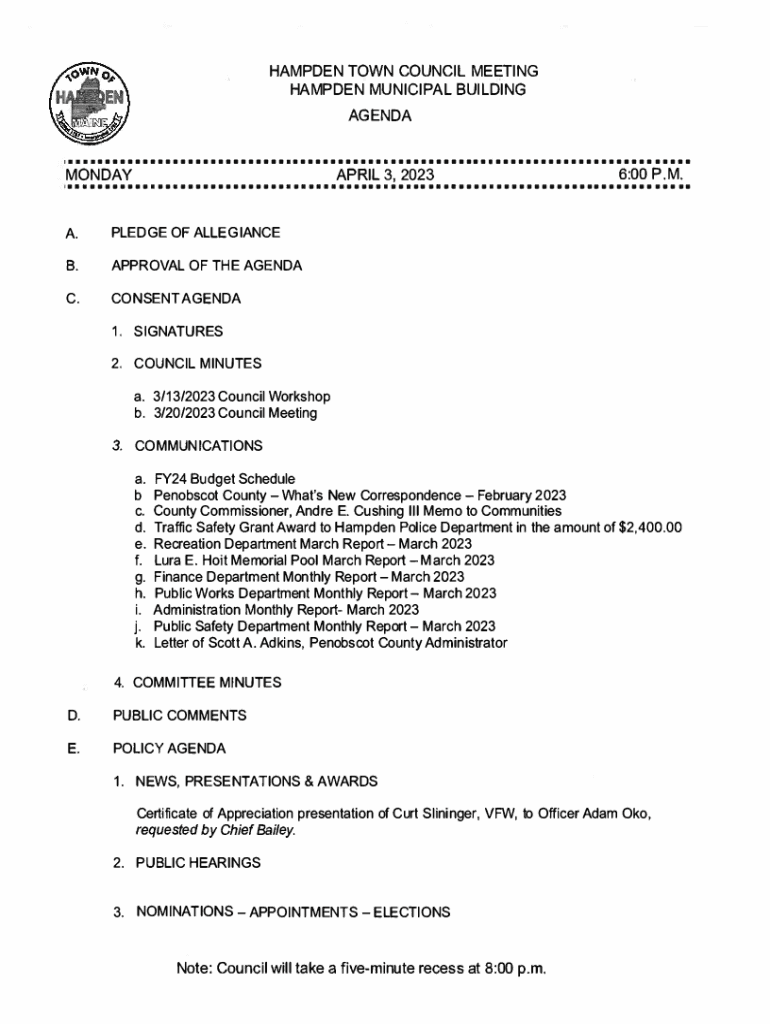 HAMDEN TOWN COUNCIL MEETING HAMDEN MUNICIPAL BUILDING AGENDA i,6:00 P.M. APRIL 3, 2023 ...................................................................................MONDAY A.PLEDGE OF ALLEGIANCE.APPROVAL