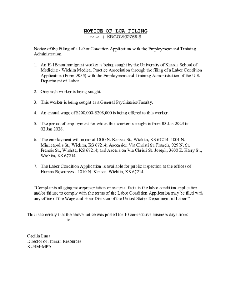 NOTICE OF LCA FILING Case # KBGOVI027686Notice of the Filing of a Labor Condition Application with the Employment and Training Administration. 1. An H1B nonimmigrant worker is being sought by the