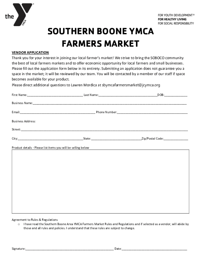 SOUTHERN BOONE YMCA FARMERS MARKET VENDOR APPLICATION Thank you for your interest in joining our local farmers market! We strive to bring the SOB OCO community the best of local farmers markets and
