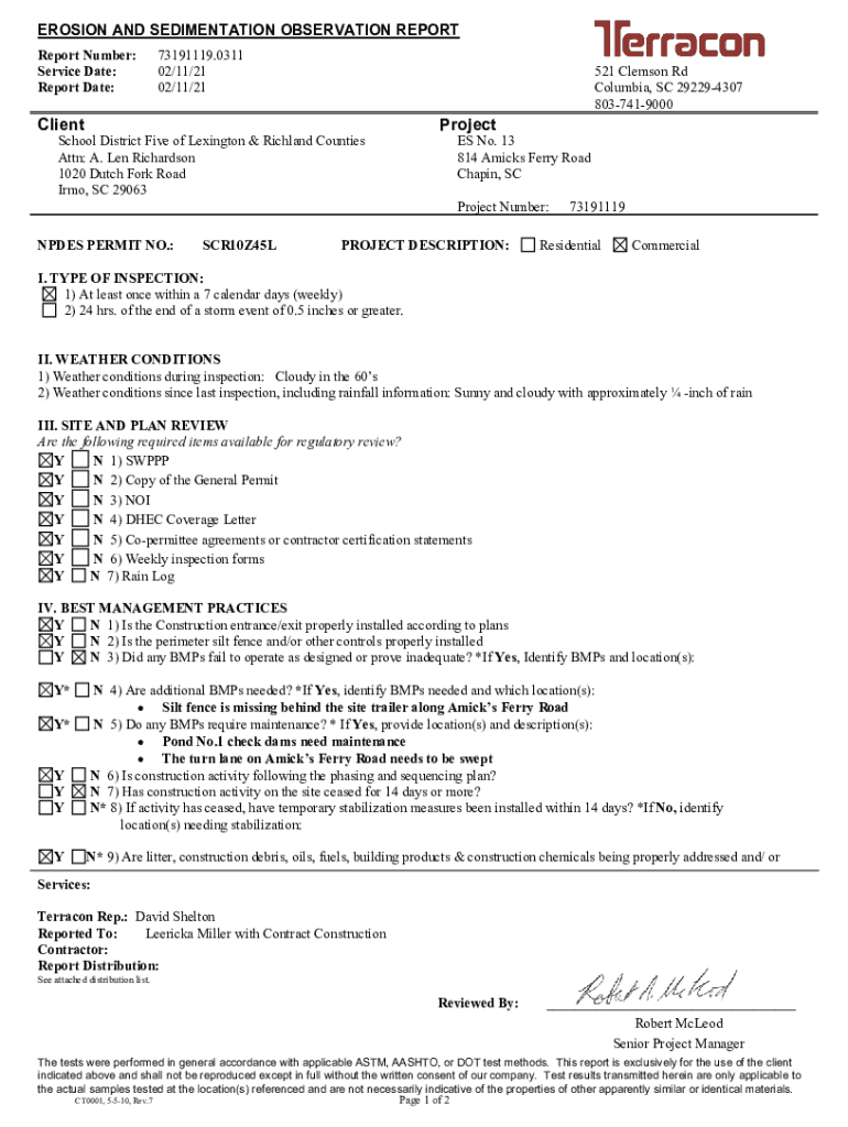 EROSION AND SEDIMENTATION OBSERVATION REPORT Number: Service Date: Report Date:73191119.0311 02/11/21 02/11/21521 Clemson Rd Columbia, SC 292294307 8037419000ClientSchool District Five of Lexington