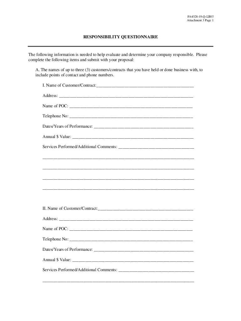FA452819QLB05 Attachment 3 Page 1RESPONSIBILITY Questionnaire following information is needed to help evaluate and determine your company responsible. Please complete the following items and submit