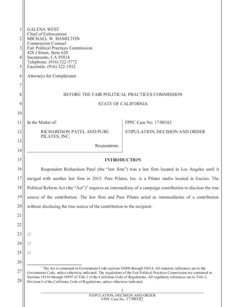 15GALENA WEST Chief of Enforcement MICHAEL W. HAMILTON Commission Counsel Fair Political Practices Commission 428 J Street, Suite 620 Sacramento, CA 95814 Telephone: (916) 3225772 Facsimile: (916)