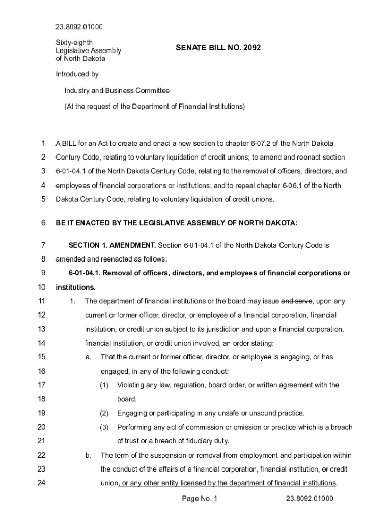 Get the free Senate Bill No. 2092 - Sixty-eighth Legislative Assembly of North Dakota - LC Number...