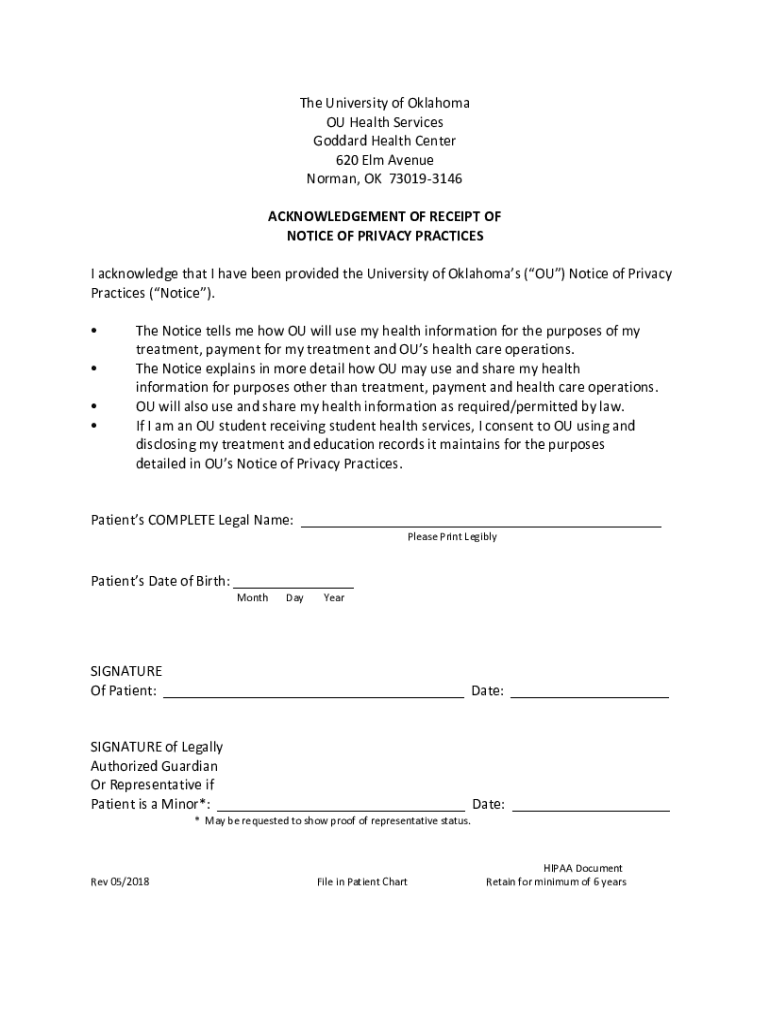 The University of Oklahoma OF Health Services Goddard Health Center 620 Elm Avenue Norman, OK 730193146 ACKNOWLEDGEMENT OF RECEIPT OF NOTICE OF PRIVACY PRACTICES I acknowledge that I have been provided
