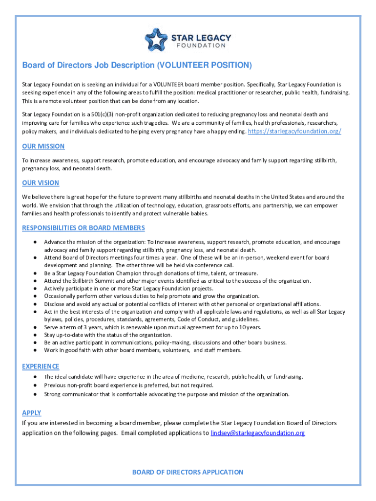 Board of Directors Job Description (VOLUNTEER POSITION) Star Legacy Foundation is seeking an individual for a VOLUNTEER board member position. Specifically, Star Legacy Foundation is seeking experience