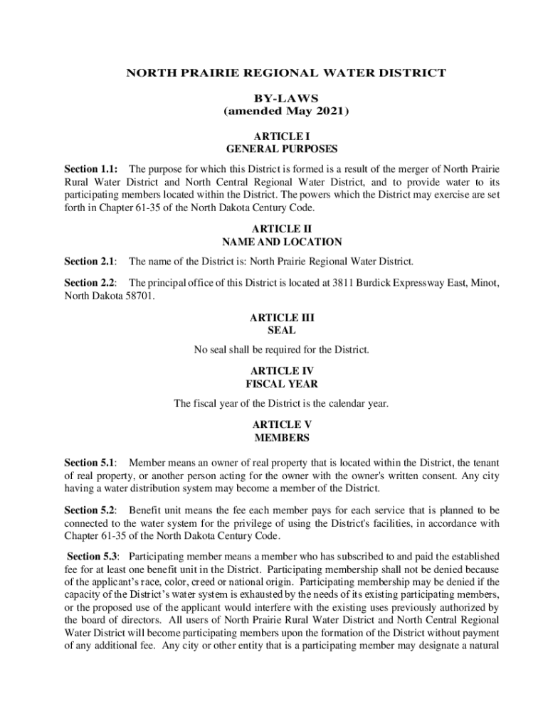 NORTH PRAIRIE REGIONAL WATER DISTRICT BYLAWS (amended May 2021) ARTICLE I GENERAL PURPOSES Section 1.1: The purpose for which this District is formed is a result of the merger of North Prairie Rural