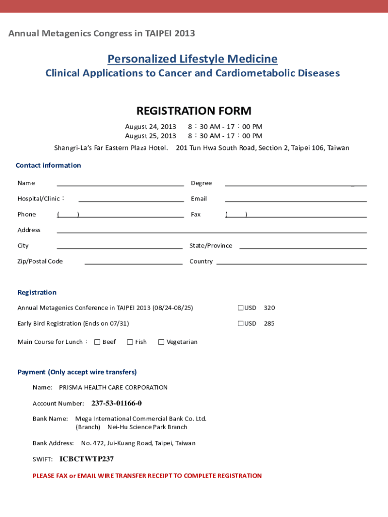 Annual Mutagenic Congress in TAIPEI 2013Personalized Lifestyle Medicine Clinical Applications to Cancer and Cardio metabolic DiseasesREGISTRATION FORM August 24, 2013, August 25, 2013830 AM 1700 PM