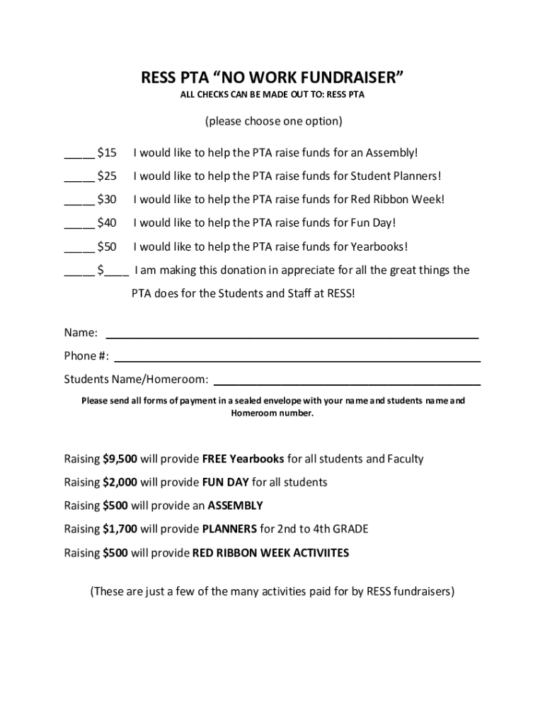 LESS PTA NO WORK FUNDRAISER ALL CHECKS CAN BE MADE OUT TO: LESS PTA(please choose one option) ___ $15I would like to help the PTA raise funds for an Assembly!___ $25I would like to help the PTA raise