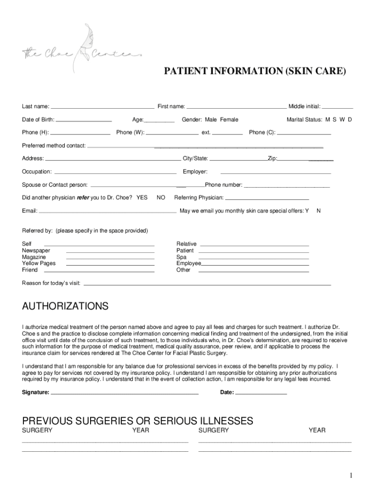 PATIENT INFORMATION (SKIN CARE)Last name: Date of Birth: Phone (H):First name: Age:___Middle initial:Gender: Male Telephone (W):Preferred method contact:ext. Marital Status: M S W D Phone (C):___Address:City/State:Occupation:Employer:Spouse