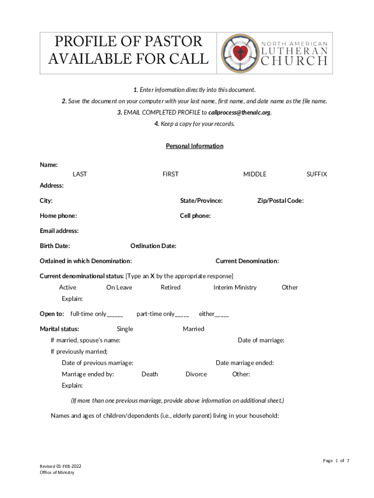 PROFILE OF PASTOR AVAILABLE FOR CALL 1. Enter information directly into this document. 2. Save the document on your computer with your last name, first name, and date name as the file name. 3. EMAIL