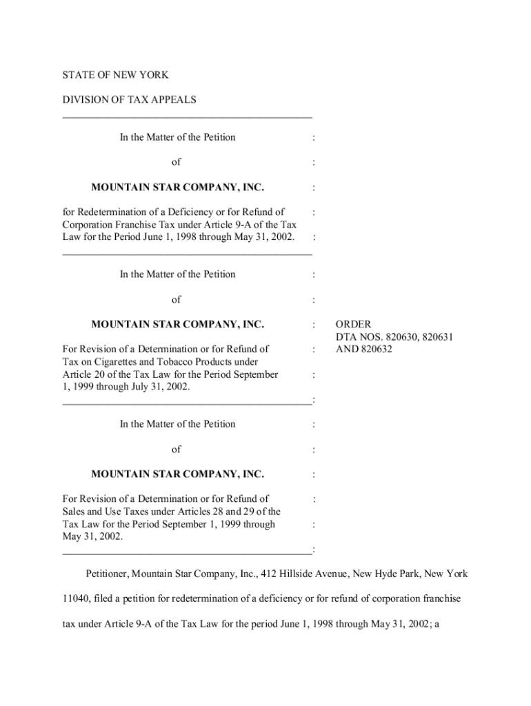 STATE OF NEW YORK DIVISION OF TAX APPEALS ___ In the Matter of the Petition:of:MOUNTAIN STAR COMPANY, INC.:for Redetermination of a Deficiency or for Refund of : Corporation Franchise Tax under Article
