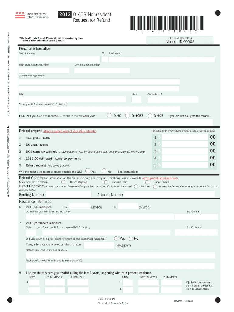 2013. 2013 D-40B P1. Nonresident Request for Refund. ST. ABLE. OTHER ... FILL IN if you filed one of these DC forms in the previous year: D- ... information on the tax refund card and program limitations,