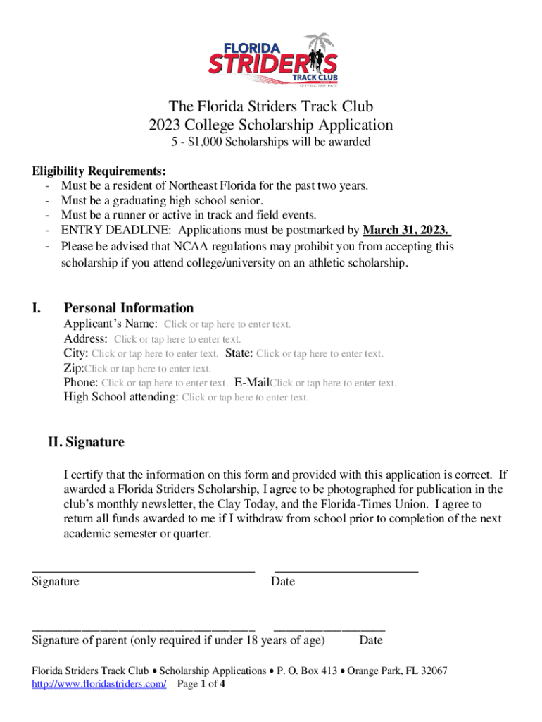 The Florida Striders Track Club 2023 College Scholarship Application $51,000 Scholarships will be awarded Eligibility Requirements: Must be a resident of Northeast Florida for the past two years.