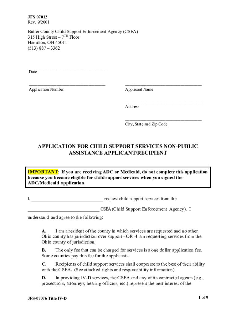 JFK 07012 Rev. 9/2001Butler County Child Support Enforcement Agency (SEA) 315 High Street 7TH Floor Hamilton, OH 45011 (513) 887 3362___ Date ___ Application Number___ Applicant Name ___ Address ___
