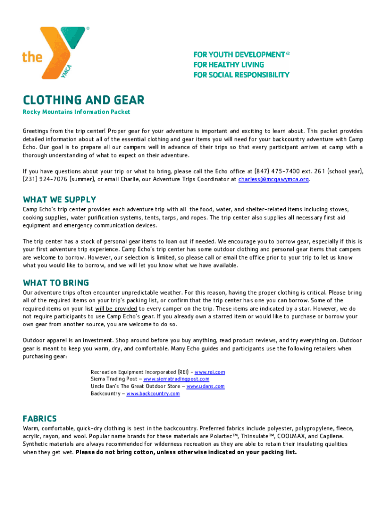 CLOTHING AND GEAR Rocky Mountains Information Packet Greetings from the trip center! Proper gear for your adventure is important and exciting to learn about. This packet provides detailed information