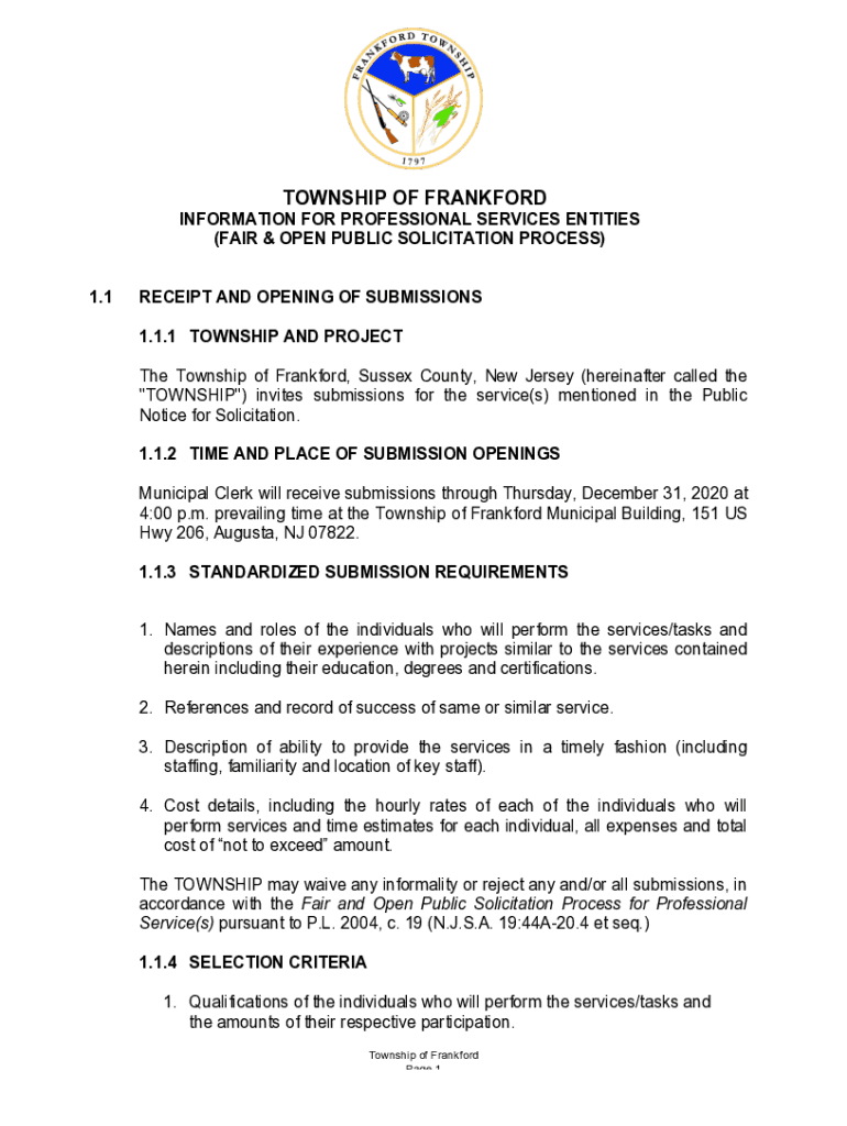 TOWNSHIP OF FRANKFORDINFORMATION FOR PROFESSIONAL SERVICES ENTITIES(FAIR & OPEN PUBLIC SOLICITATION PROCESS)1.1RECEIPT AND OPENING OF SUBMISSIONS