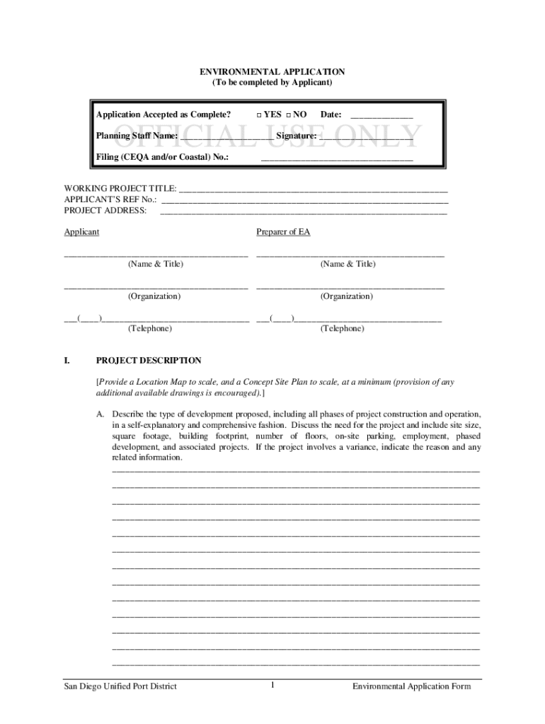 ENVIRONMENTAL APPLICATION (To be completed by Applicant)Application Accepted as Complete? YES Notate:___OFFICIAL USE ONLYPlanning Staff Name: ___ Signature: ___ Filing (CEA and/or Coastal) No.:___WORKING