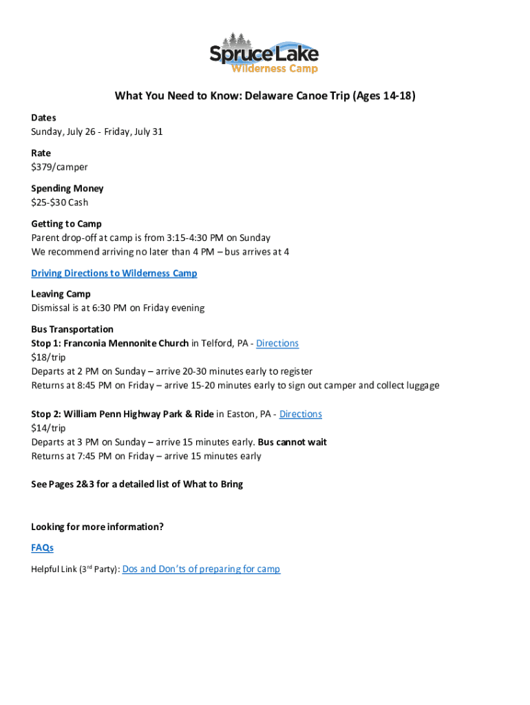 What You Need to Know: Delaware Canoe Trip (Ages 1418) Dates Sunday, July 26 Friday, July 31 Rate $379/camper Spending Money $$2530 Cash Getting to Camp Parent drop-off at camp is from 3:154:30 PM