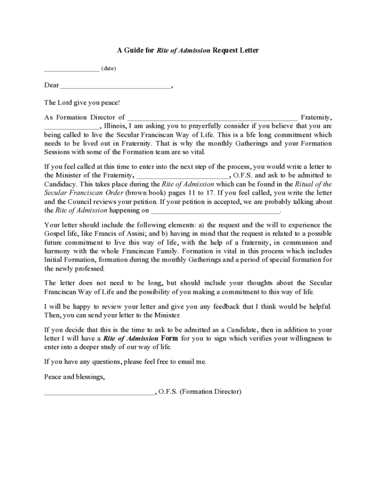 A Guide for Rite of Admission Request Letter ___ (date) Dear ___, The Lord give you peace! As Formation Director of ___ Fraternity, ___, Illinois, I am asking you to prayerfully consider if you believe