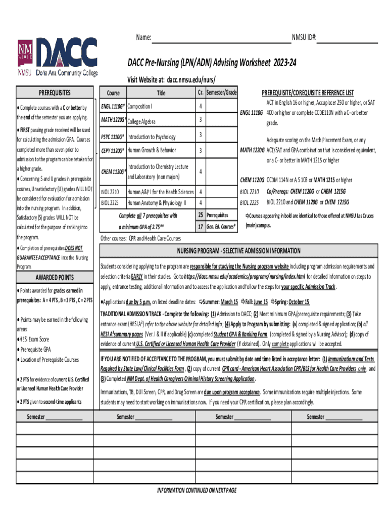 Get the free DACC Pre-Nursing (LPN/ADN) Advising Worksheet 2023-24