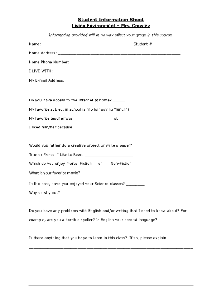 Student Information Sheet Living Environment Mrs. Crowley Information provided will in no way affect your grade in this course. Name: ___Student #___Home Address: ___ Home Phone Number: ___ I LIVE