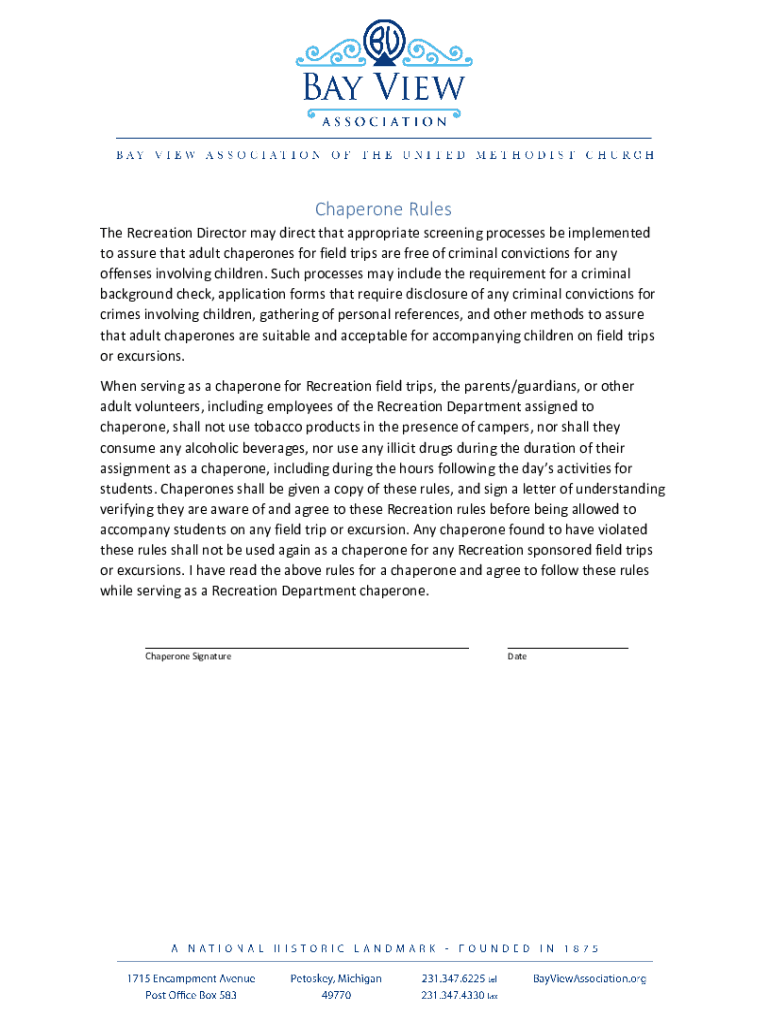 Chaperone Rules The Recreation Director may direct that appropriate screening processes be implemented to assure that adult chaperones for field trips are free of criminal convictions for any offenses
