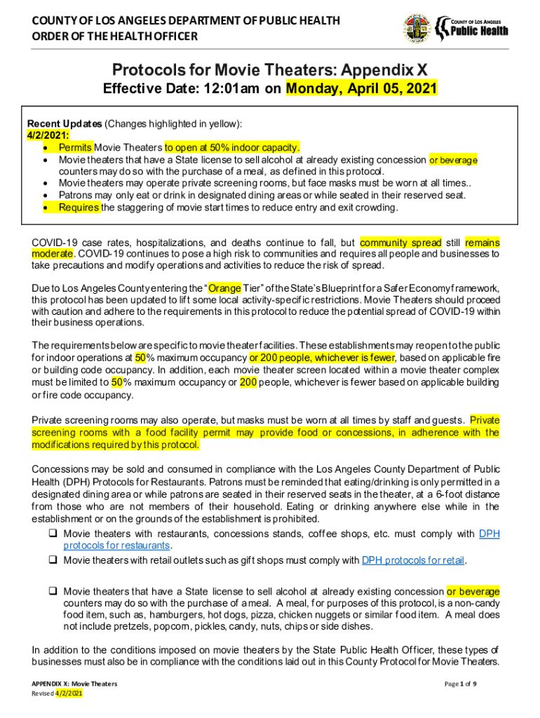 COUNTY OF LOS ANGELES DEPARTMENT OF PUBLIC HEALTH ORDER OF THE HEALTH OFFICERProtocols for Movie Theaters: Appendix Effective Date: 12:01am on Monday, April 05, 2021, Recent Updates (Changes highlighted