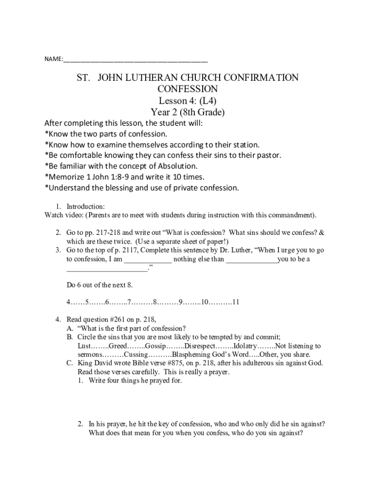 NAME:___ST. JOHN LUTHERAN CHURCH CONFIRMATION CONFESSION Lesson 4: (L4) Year 2 (8th Grade)After completing this lesson, the student will: *Know the two parts of confession. *Know how to examine themselves