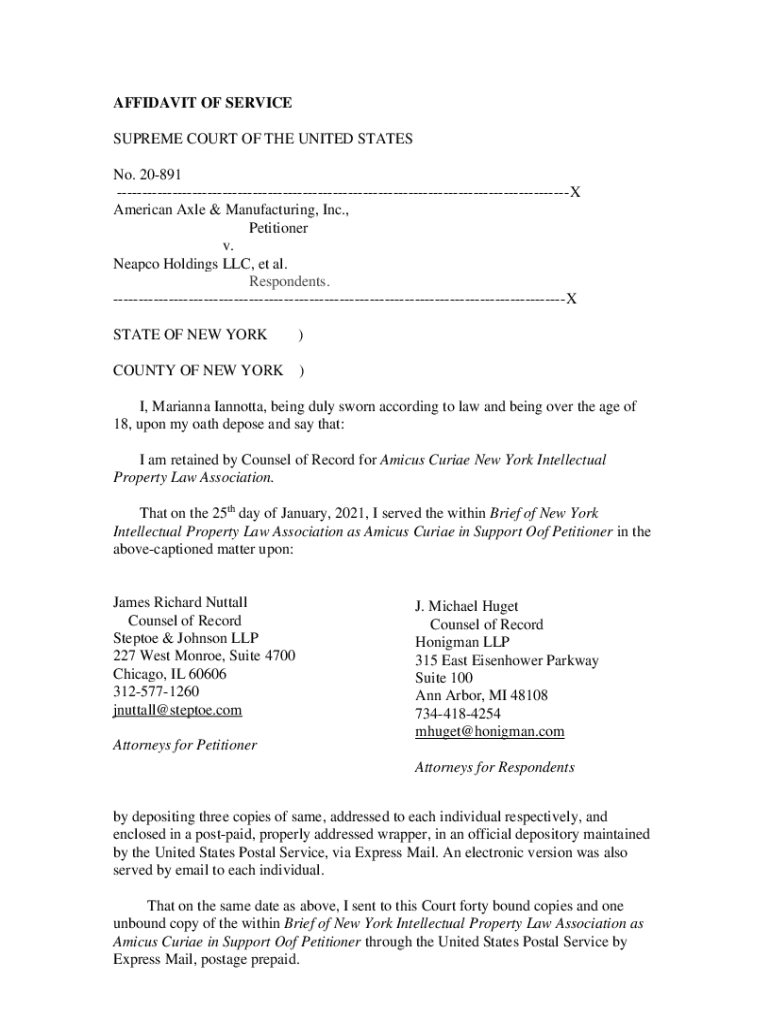 AFFIDAVIT OF SERVICE SUPREME COURT OF THE UNITED STATES No. 20891 X American Axle & Manufacturing, Inc., Petitioner v. Neap co Holdings LLC, et al. Respondents. X STATE OF NEW YORK)COUNTY OF NEW YORK)I,