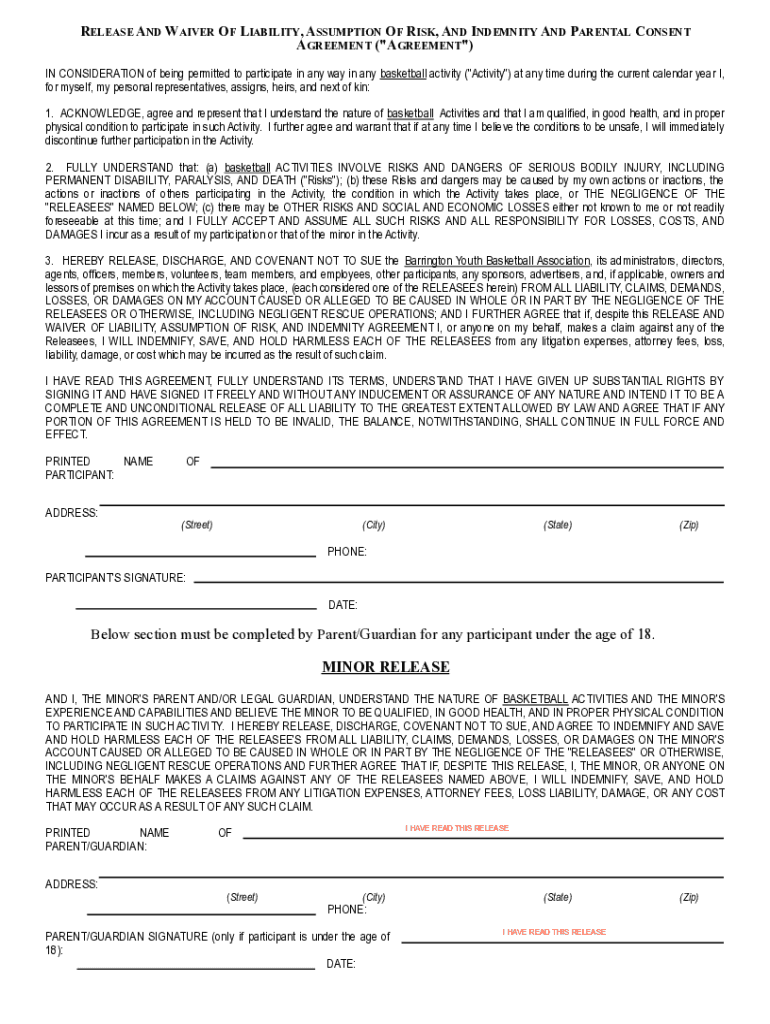 RELEASE AND WAIVER OF LIABILITY, ASSUMPTION OF RISK, AND INDEMNITY AND PARENTAL CONSENT AGREEMENT (\” AGREEMENT\”) IN CONSIDERATION of being permitted to participate in any way in any basketball