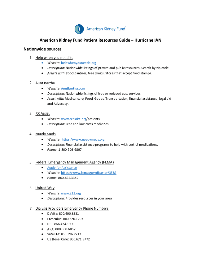 American Kidney Fund Patient Resources Guide Hurricane IAN Nationwide sources 1. Help when you need it. Website: helpwhenyouneedit.org Description: Nationwide listings of private and public resources.