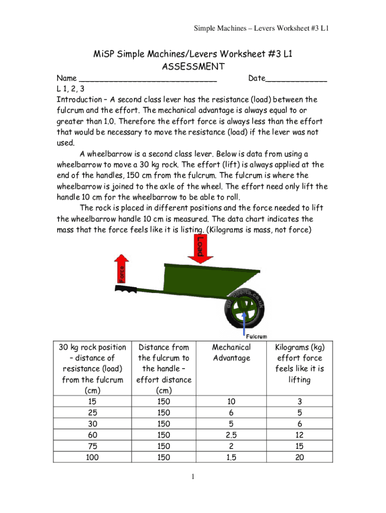 Simple Machines Levers Worksheet #3 L1MiSP Simple Machines/Levers Worksheet #3 L1 ASSESSMENTName ___ Date___ L 1, 2, 3 Introduction A second class lever has the resistance (load) between the fulcrum