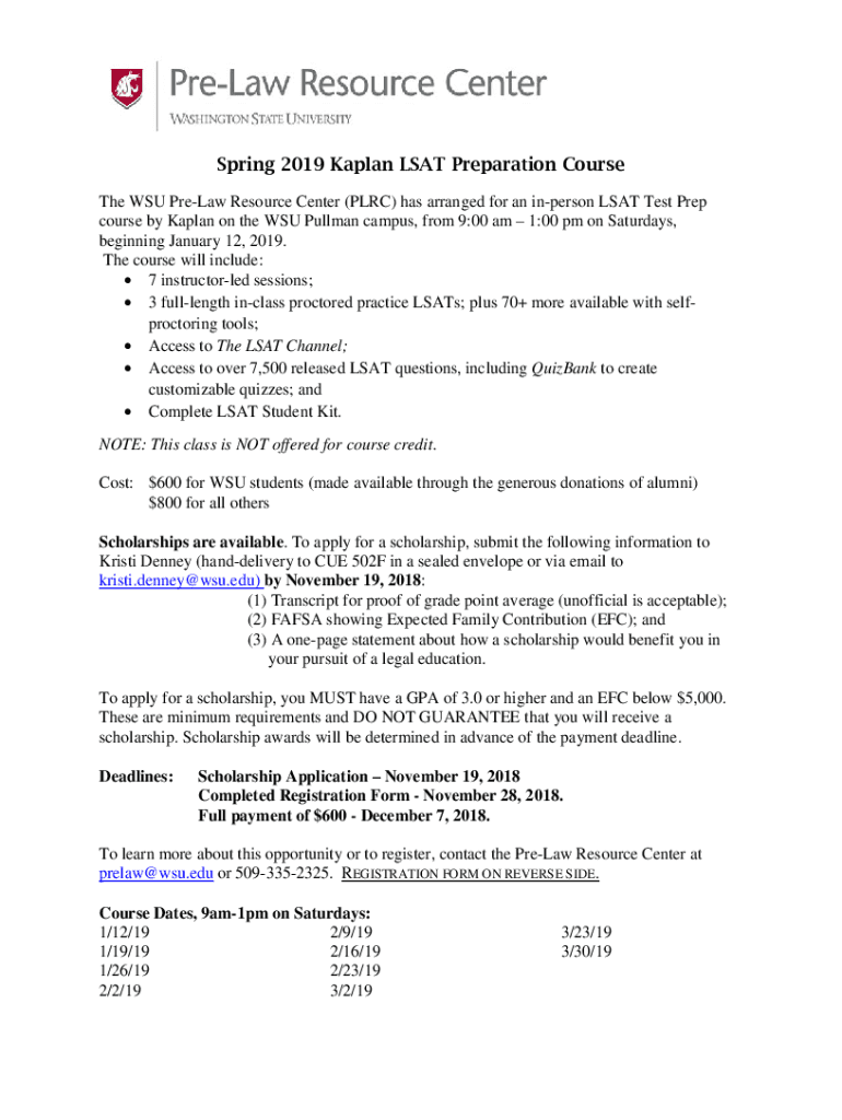 Spring 2019 Kaplan LSAT Preparation Course The WSU PreLaw Resource Center (PRC) has arranged for an unperson LSAT Test Prep course by Kaplan on the WSU Pullman campus, from 9:00 am 1:00 pm on Saturdays,