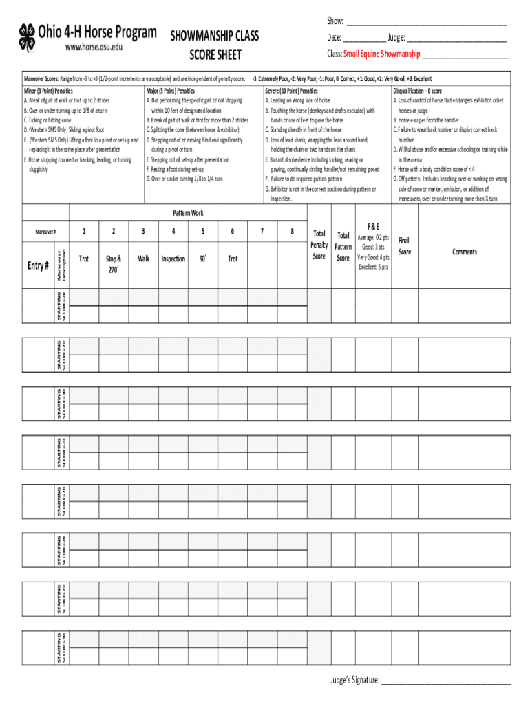 Show: ___ Date: ___ Judge: ___ Class: Small Equine Showmanship ___SHOWMANSHIP CLASS Scoresheet Maneuver Scores: Range from 3 to +3 (1/2point increments are acceptable) and are independent of penalty