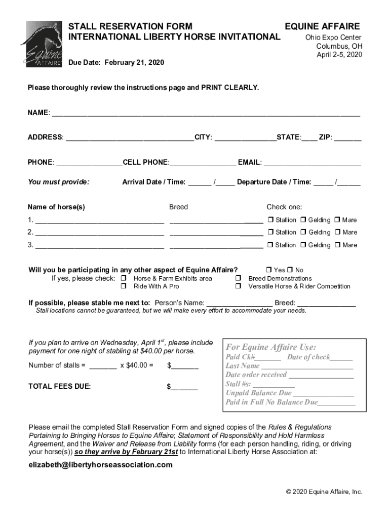 INTERNATIONAL LIBERTY HORSE INVITATIONAL STALL RESERVATION FORMEQUINE AFFAIREOhio Expo Columbus, OH April 25, 2020Due Date: February 21, 2020Arrival and Departure Dates: Competitors are not required