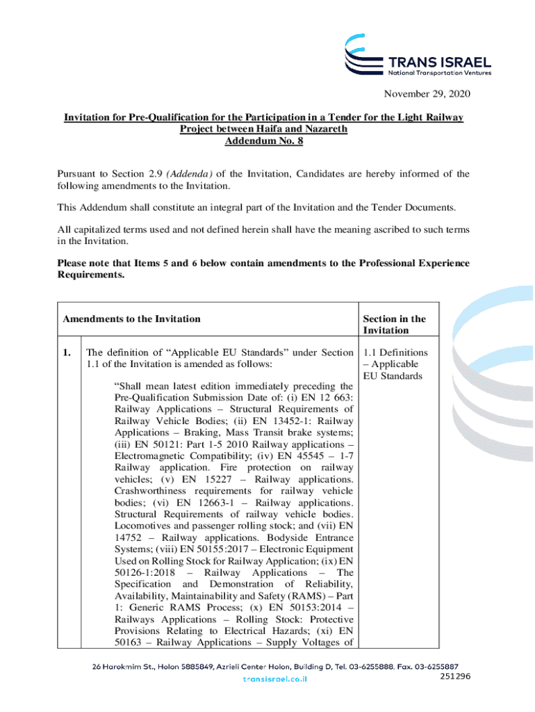 November 29, 2020, Invitation for PreQualification for the Participation in a Tender for the Light Railway Project between Haifa and Nazareth Addendum No. 8 Pursuant to Section 2.9 (Addenda) of the