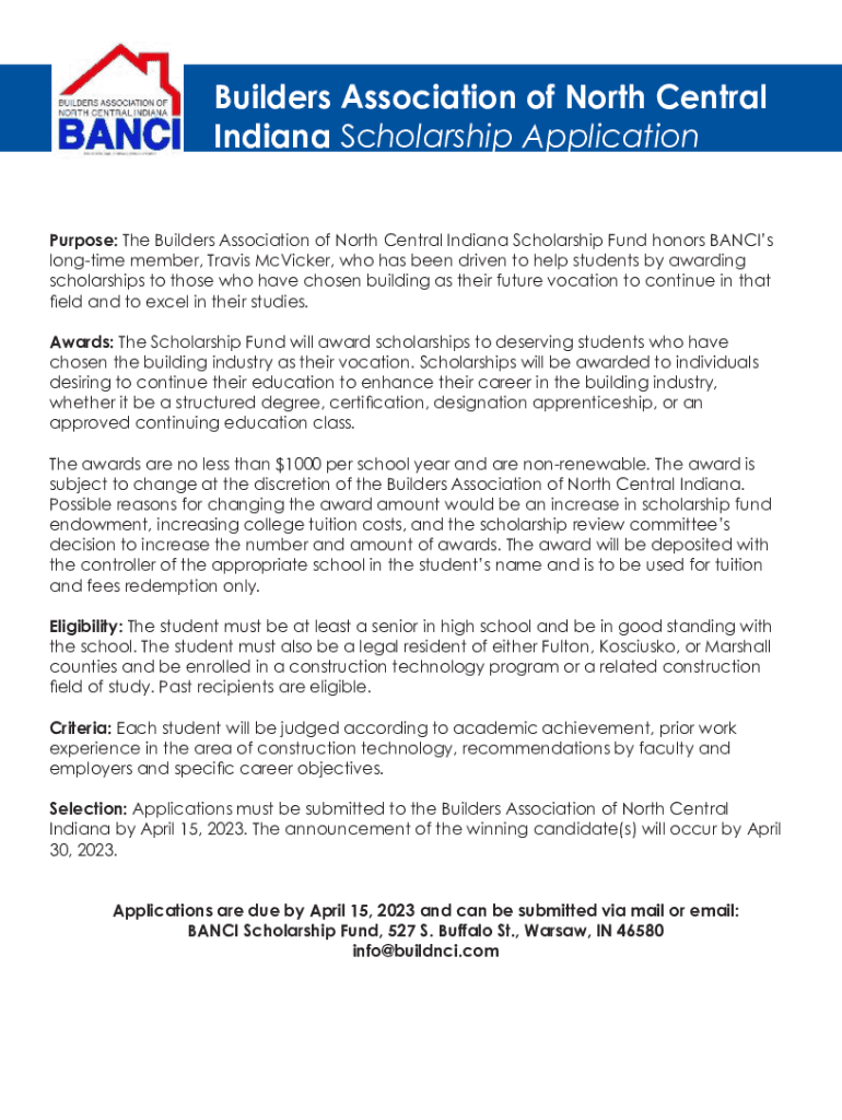 Builders Association of North Central Indiana Scholarship Application Purpose: The Builders Association of North Central Indiana Scholarship Fund honors Bancos longtime member, Travis Clicker, who
