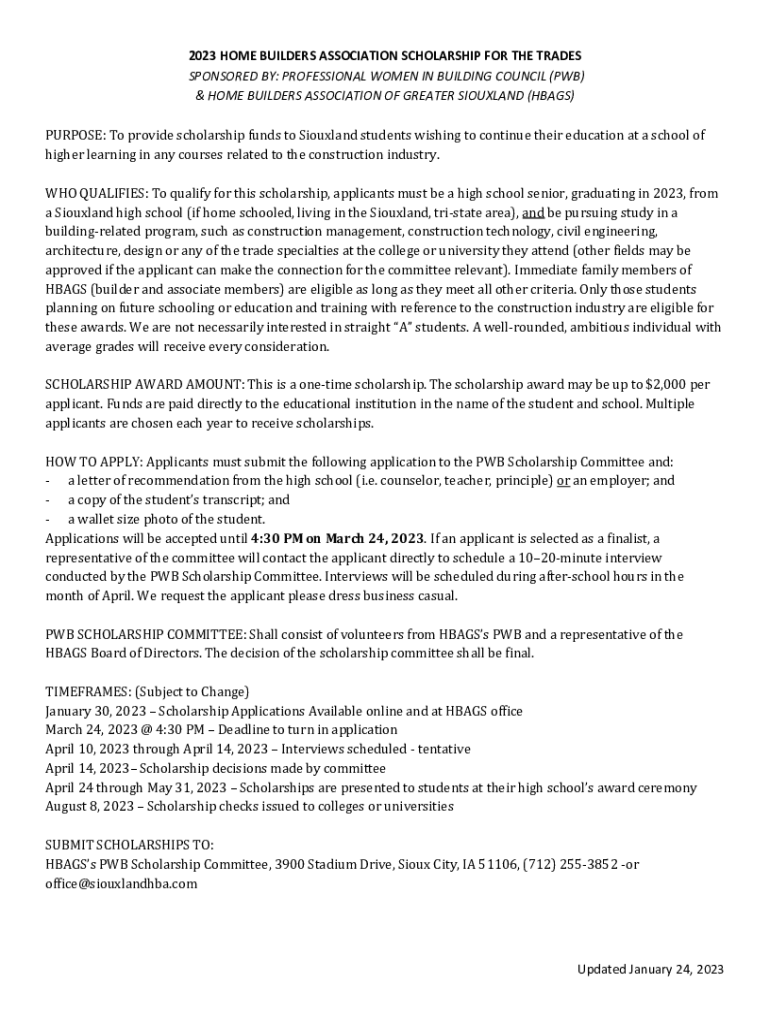 2023 HOME BUILDERS ASSOCIATION SCHOLARSHIP FOR THE TRADES SPONSORED BY: PROFESSIONAL WOMEN IN BUILDING COUNCIL (PWB) & HOME BUILDERS ASSOCIATION OF GREATER SCOTLAND (BAGS) PURPOSE: To provide scholarship