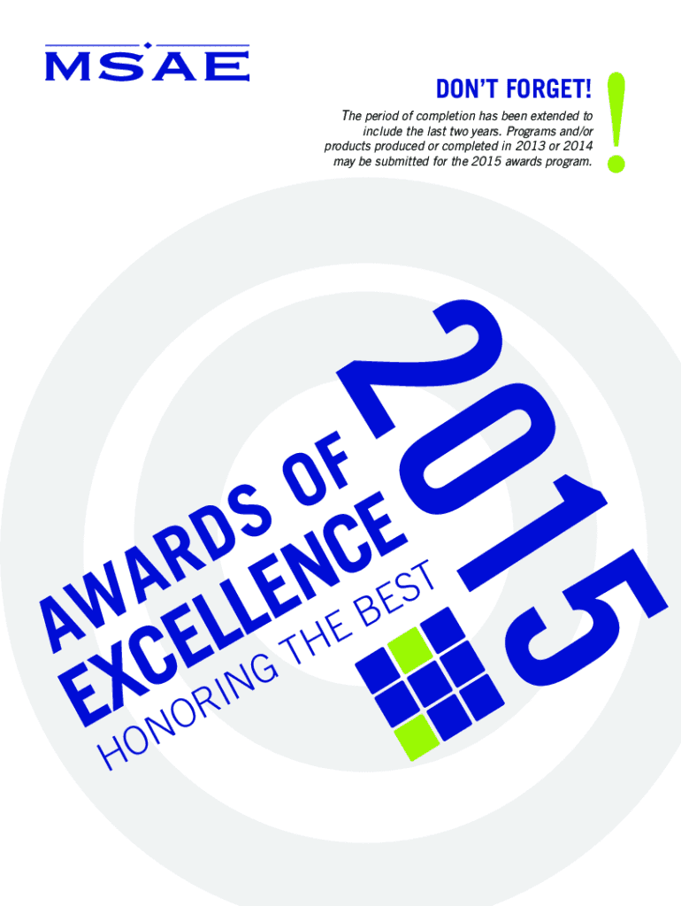 !DON'T FORGET! The period of completion has been extended to include the last two years. Programs and/or products produced or completed in 2013 or 2014 may be submitted for the 2015 awards program.201S