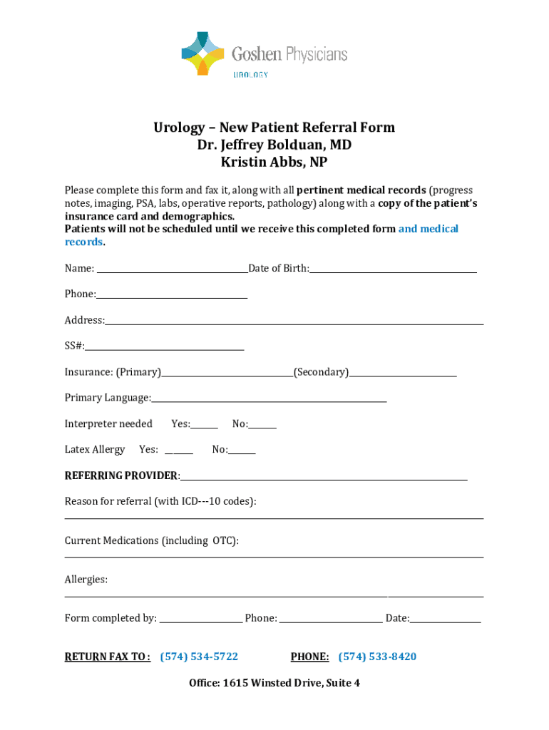 Urology New Patient Referral Form Dr. Jeffrey Goldman, MD Kristin BBS, NP Please complete this form and fax it, along with all pertinent medical records (progress notes, imaging, PSA, labs, operative