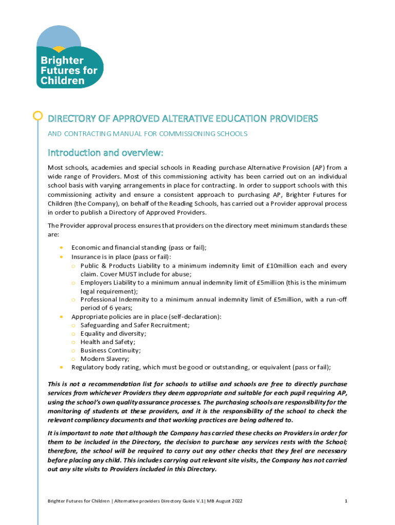 DIRECTORY OF APPROVED ALTERNATIVE EDUCATION PROVIDERS AND CONTRACTING MANUAL FOR COMMISSIONING SCHOOLSIntroduction and overview: Most schools, academies and special schools in Reading purchase Alternative