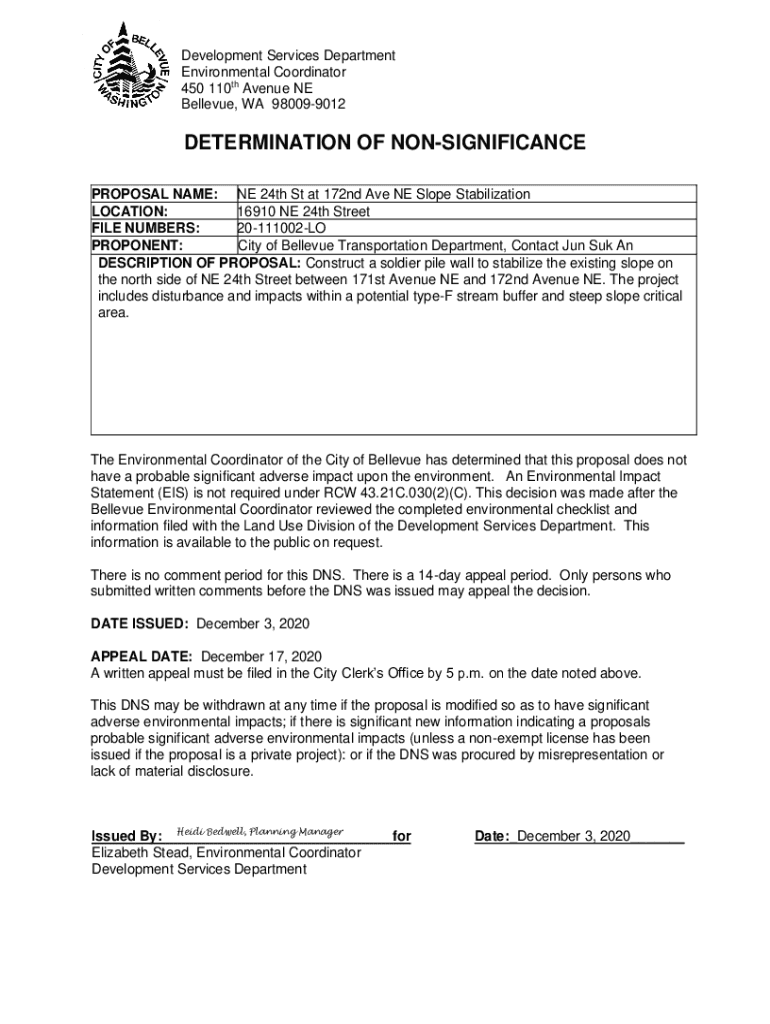 Development Services Department Environmental Coordinator 450 110th Avenue NE Bellevue, WA 980099012DETERMINATION OF INSIGNIFICANCE PROPOSAL NAME: NE 24th St at 172nd Ave NE Slope Stabilization LOCATION: