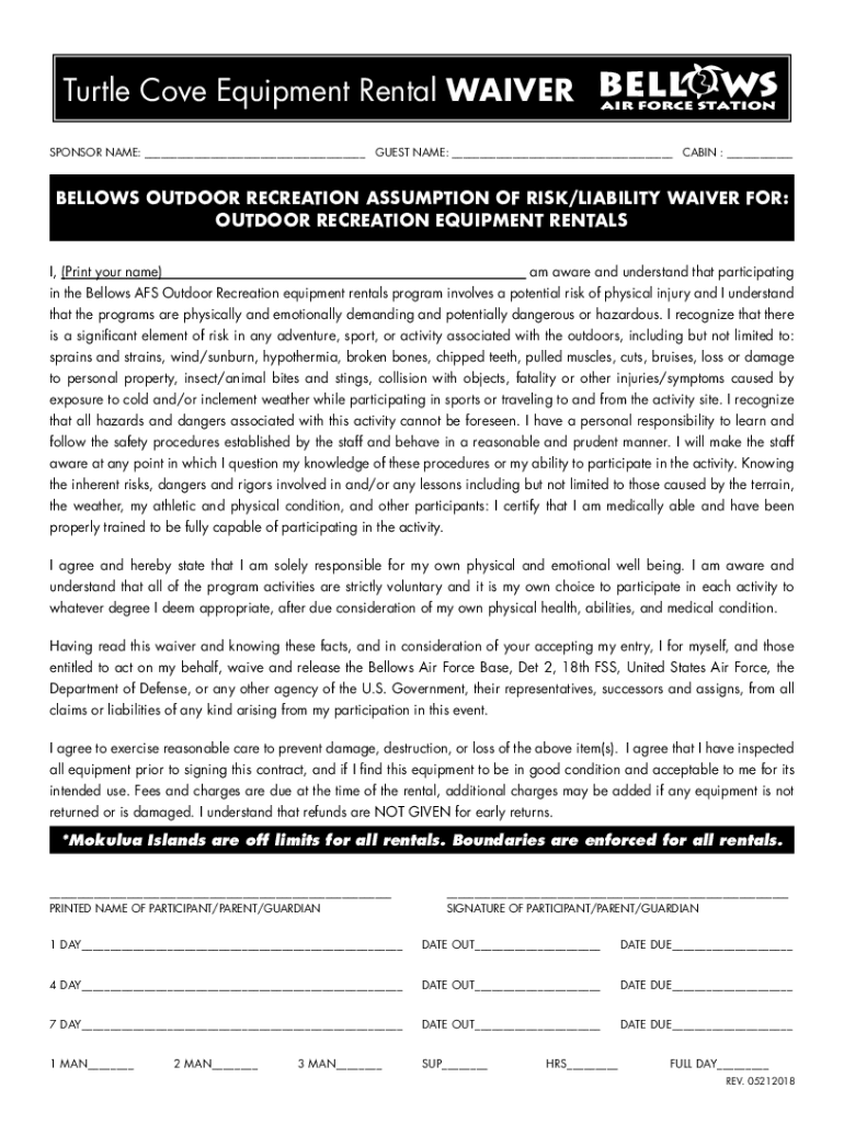 Turtle Cove Equipment Rental WAIVER Sponsor Name: ___ Guest Name: ___ Cabin : ___BELLOWS OUTDOOR RECREATION ASSUMPTION OF RISK/LIABILITY WAIVER FOR: OUTDOOR RECREATION EQUIPMENT RENTALS I, (Print