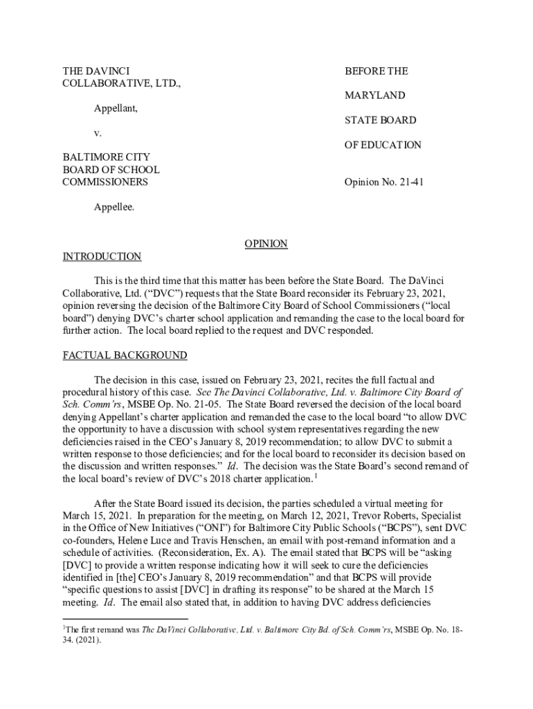 Get the free The DaVinci Collaborative, LTD. v. Baltimore City Board of School Commissioners. Sta...