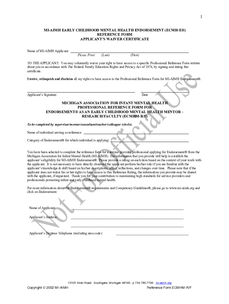 1 MIA IMH EARLY CHILDHOOD MENTAL HEALTH ENDORSEMENT (ECHO) REFERENCE FORM APPLICANTS WAIVER CERTIFICATE Name of MIA IMH Applicant: Please Print:(Last)(First)TO THE APPLICANT: You may voluntarily waive